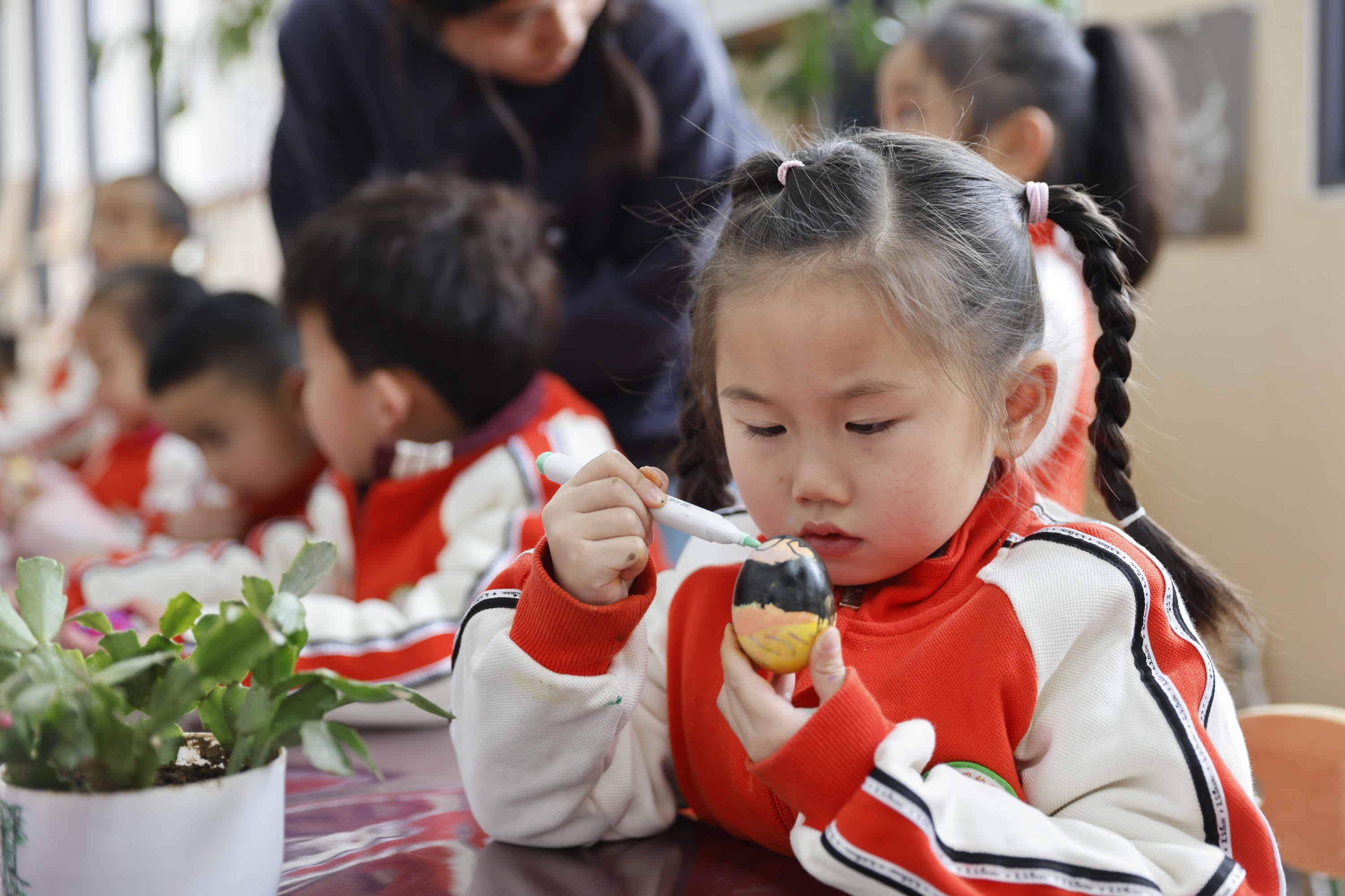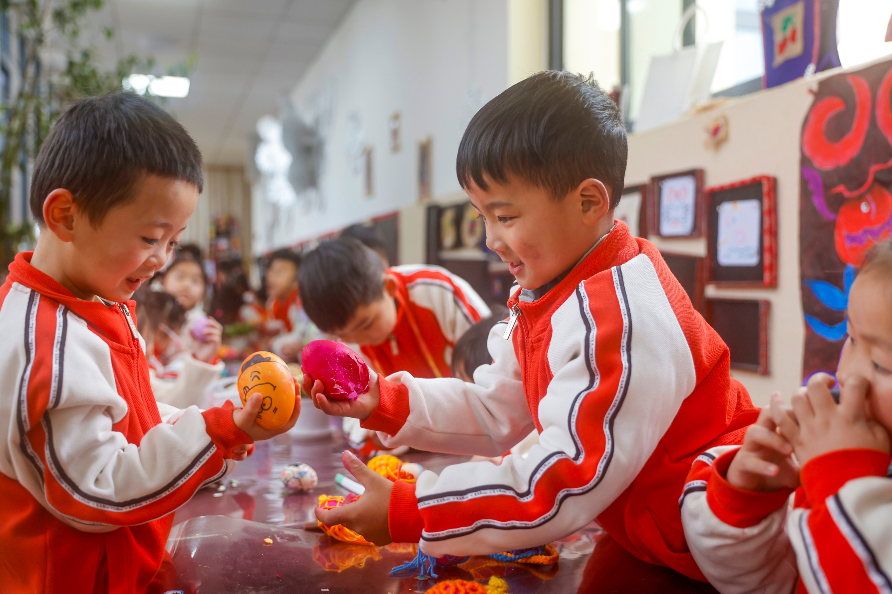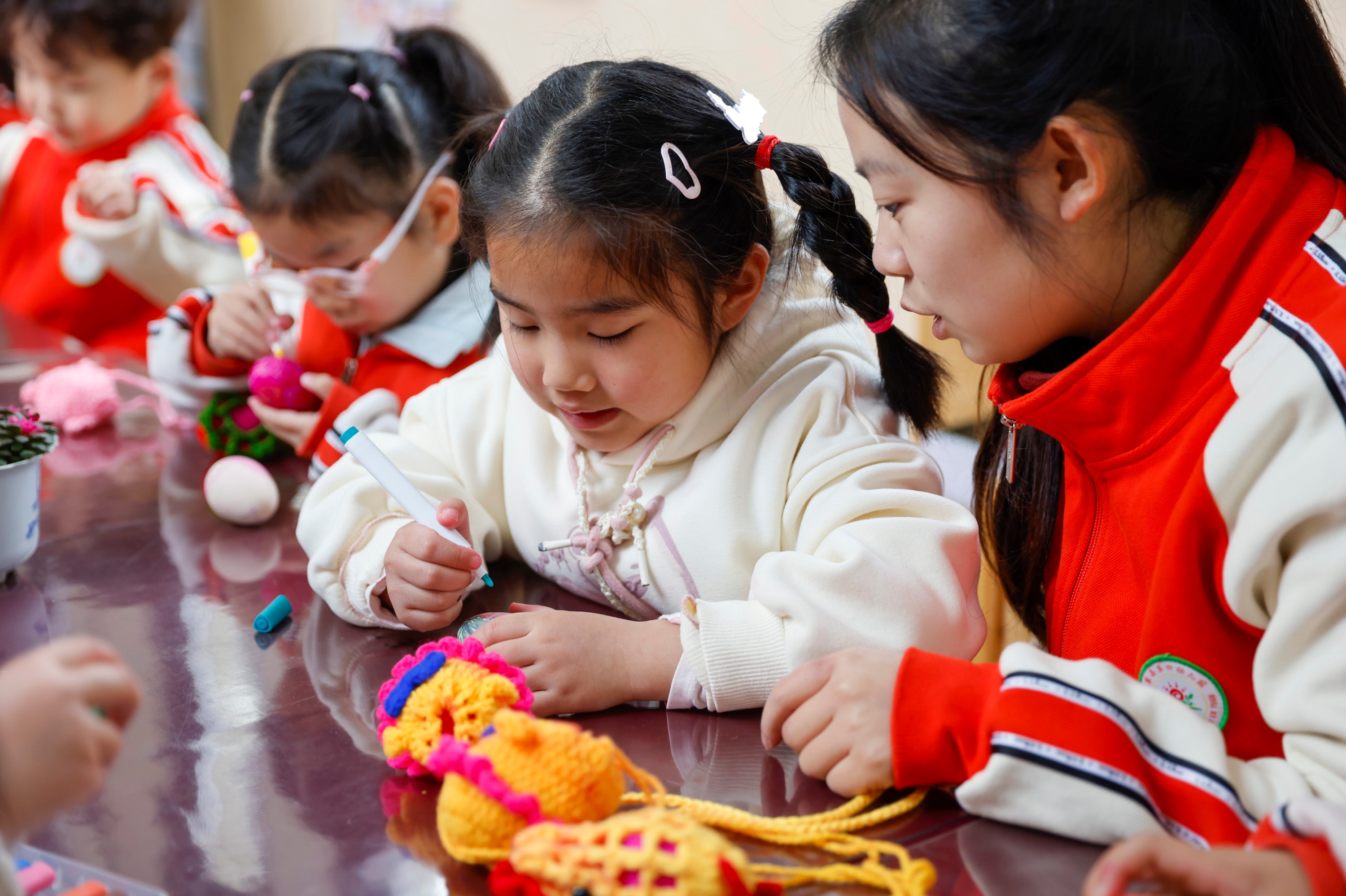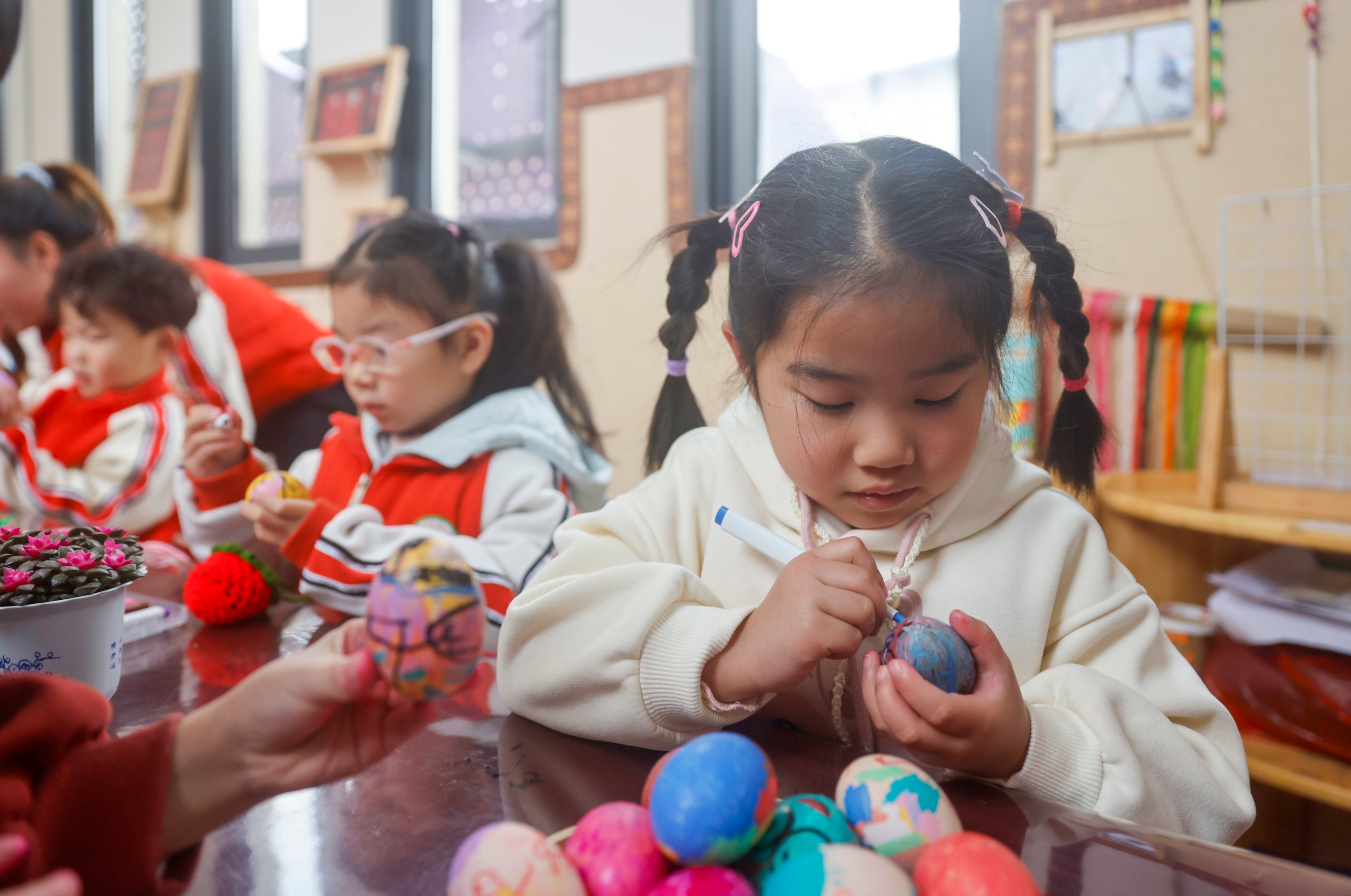 2025年2月28日,贵州省黔东南苗族侗族自治州施秉县第四幼儿园的小朋友在画彩蛋。(磨桂宾 摄)