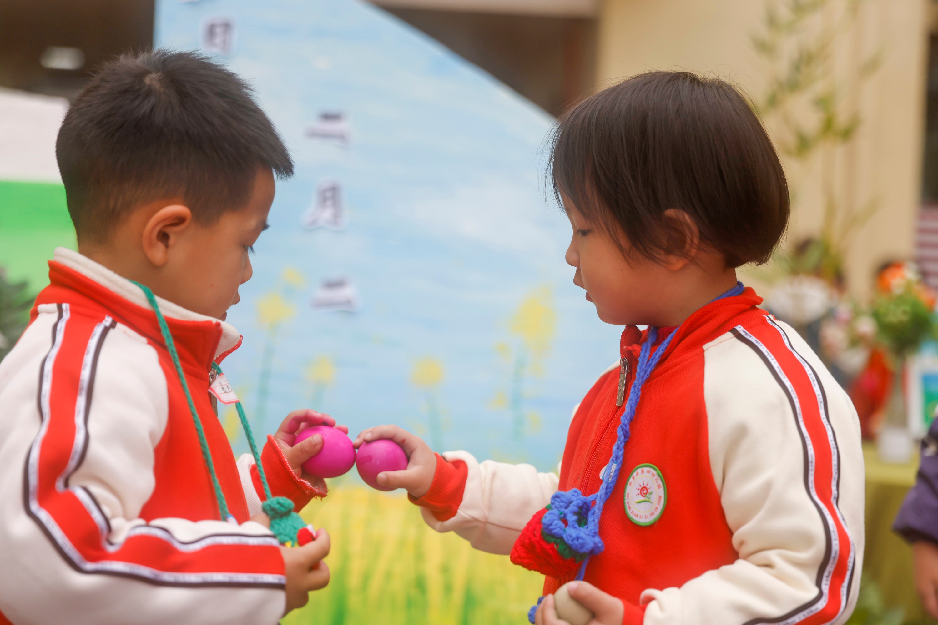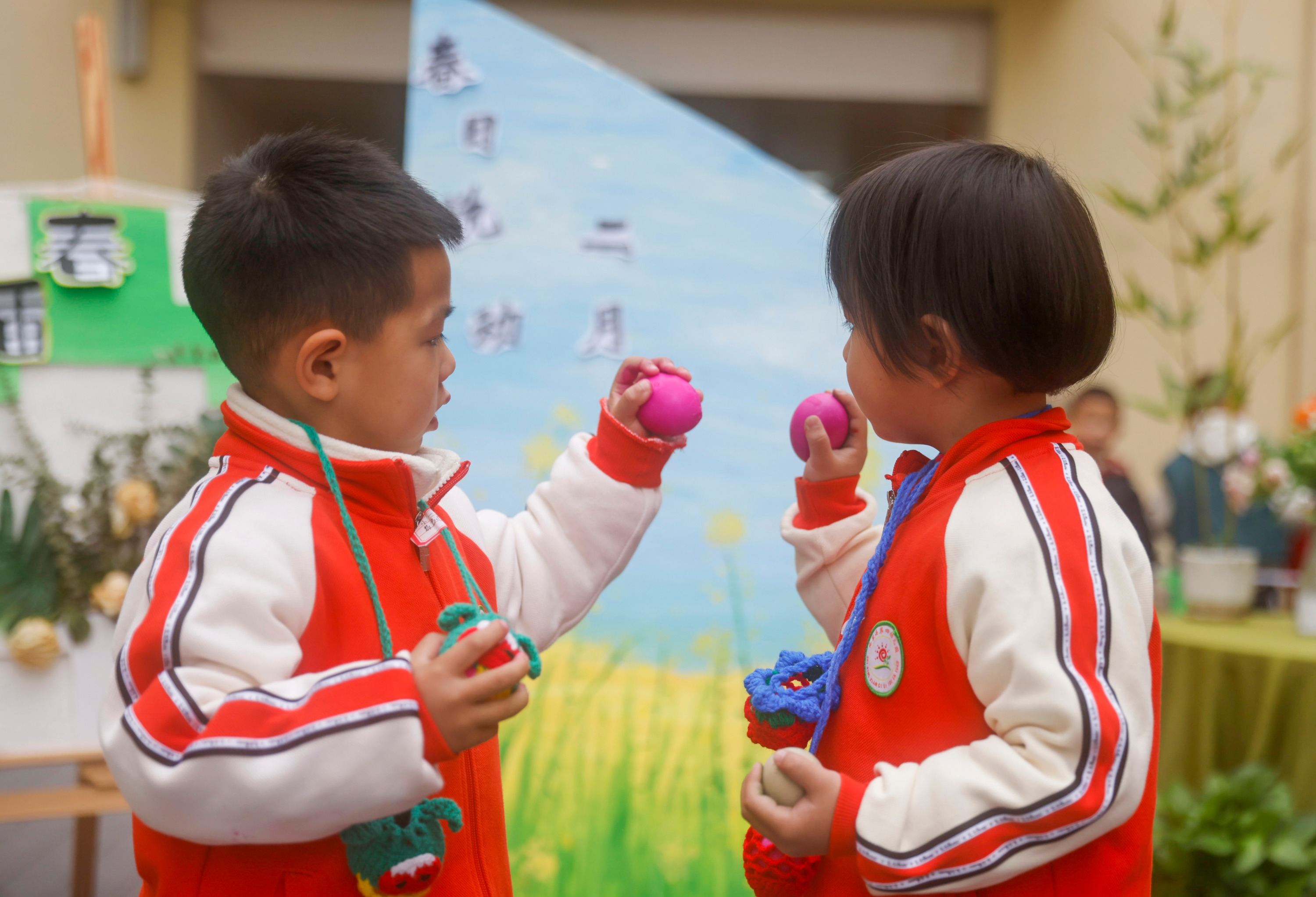 2025年2月28日,贵州省黔东南苗族侗族自治州施秉县第四幼儿园的小朋友在玩斗蛋。(磨桂宾 摄)