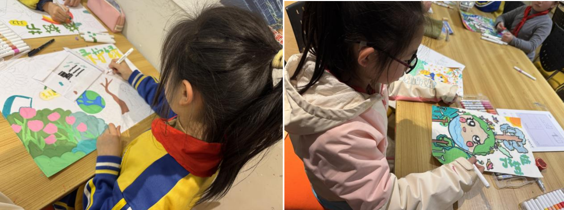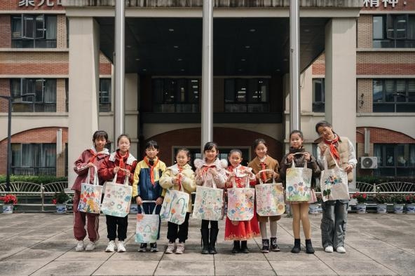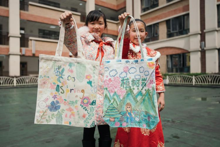 在另一个系类活动“手绘环保袋”中,孩子们围绕春天与环保主题,用颜料、针线在布袋上创作。一幅幅作品,承载着他们对春天的热爱和对环保的理解。