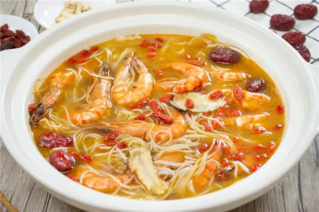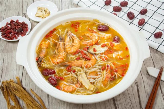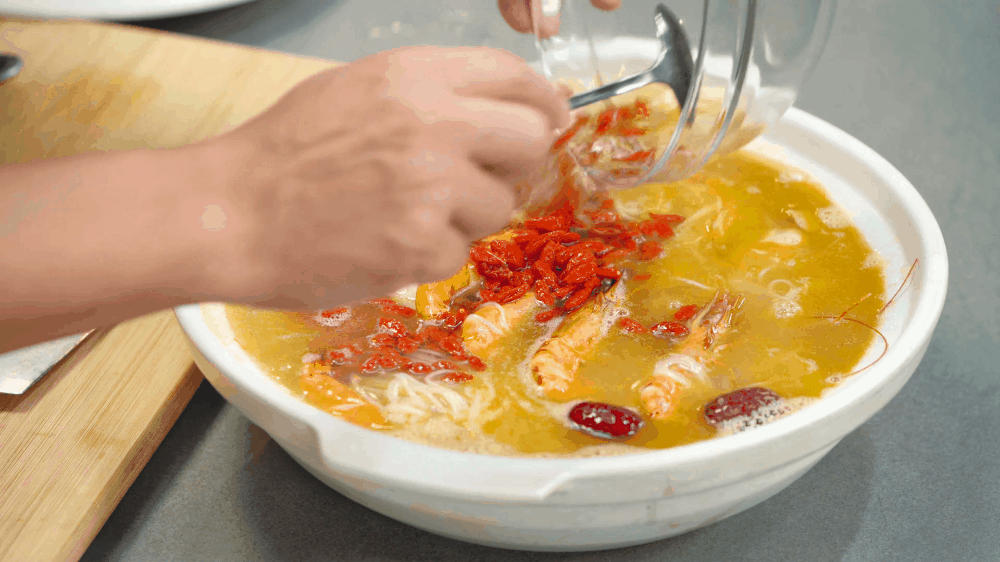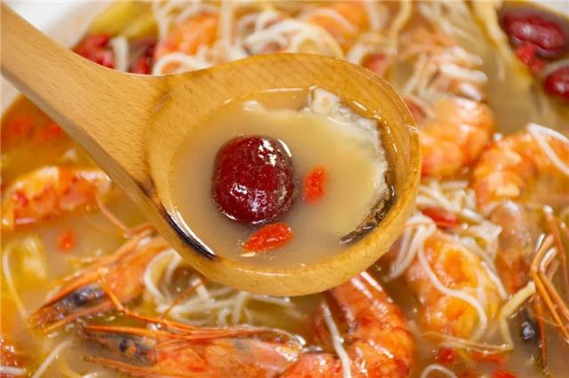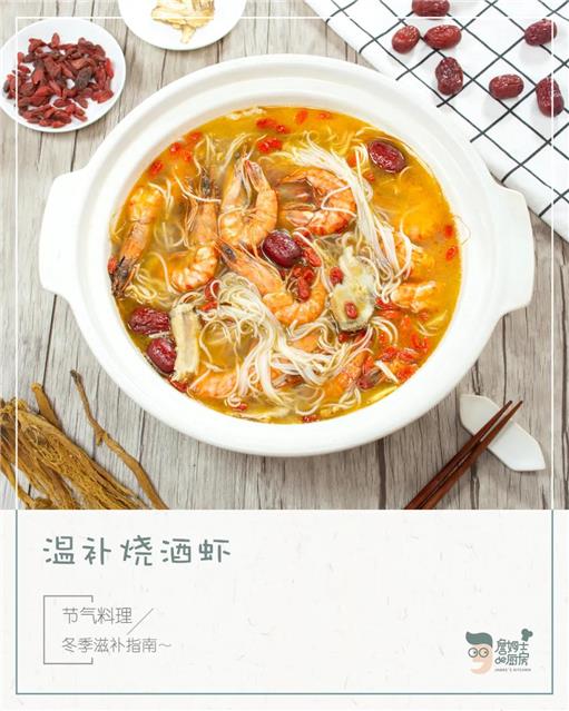 煮好后将这一锅盛出,淋上泡好的枸杞酒,一碗温补的烧酒虾就制作完成啦!