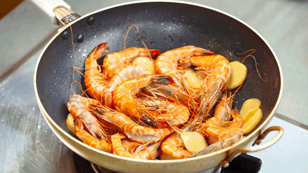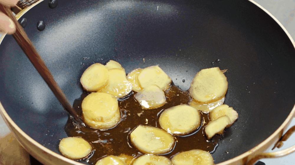 热锅放香油稍微煸炒一下姜片,然后放入大虾。