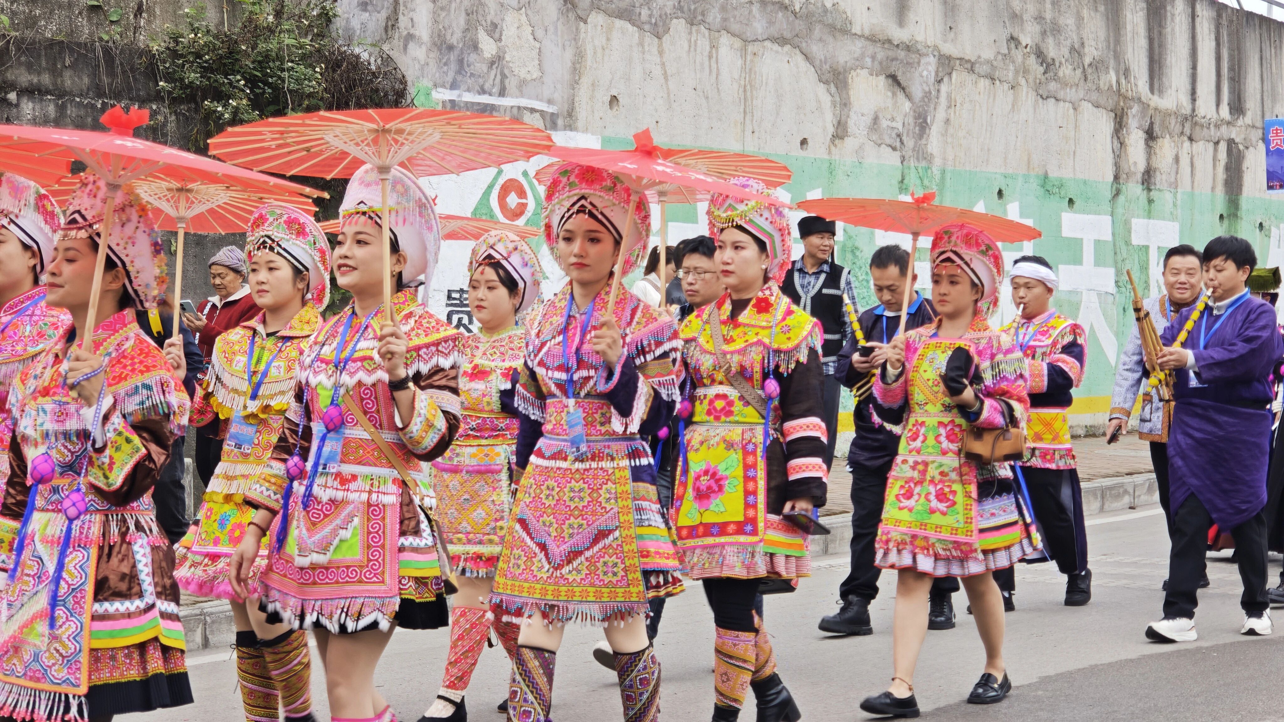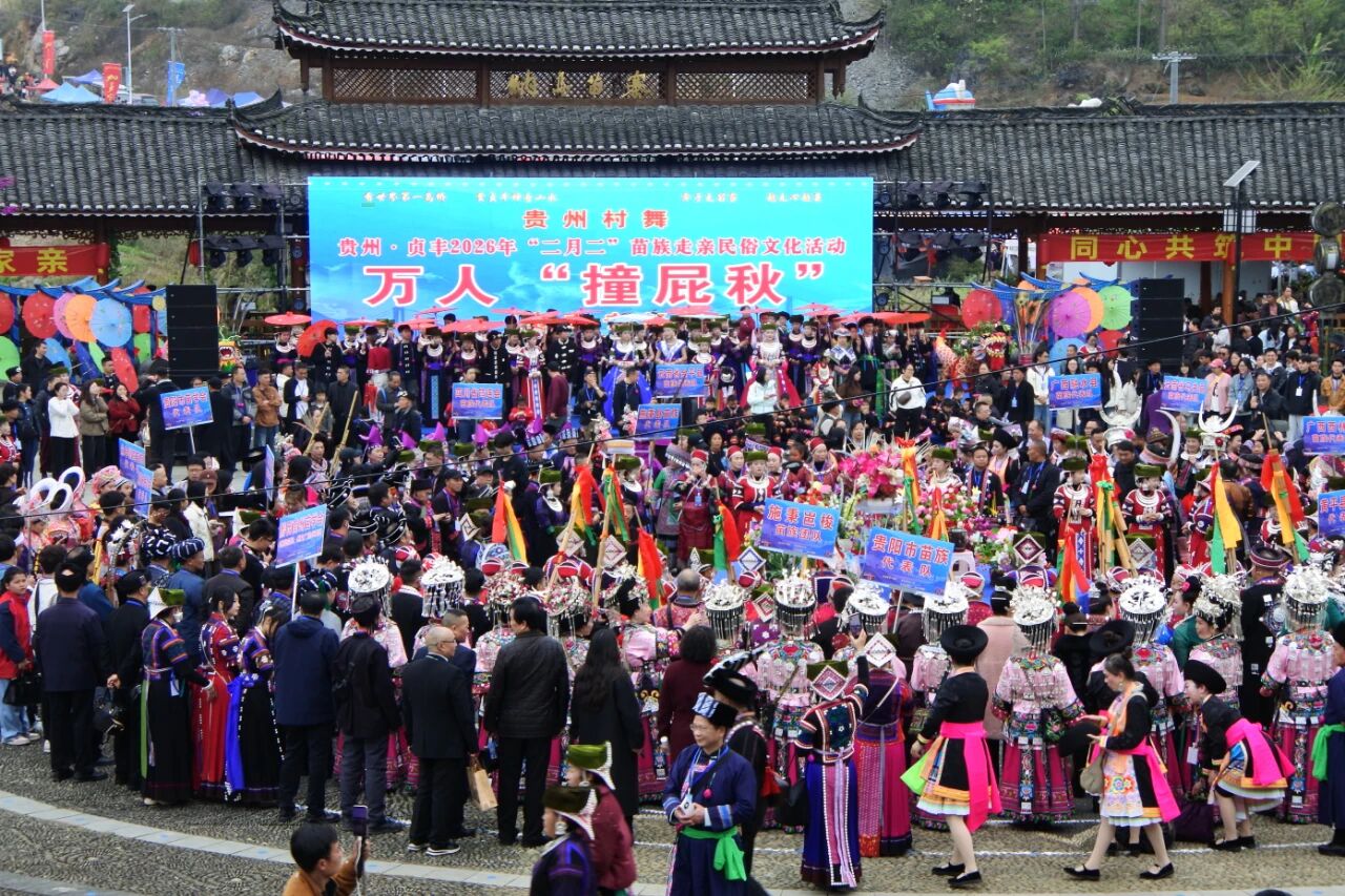 贞丰苗族同胞杨贞秀介绍:“每逢‘二月二’,我们都会邀请全国各地的苗族同胞过来走亲。活动中有拦门酒、‘撞屁秋’等特色习俗,其中,‘撞屁秋’是我们苗族欢迎远道而来的贵客最热情、最隆重的方式,也寄托着碰撞好运的美好寓意。”