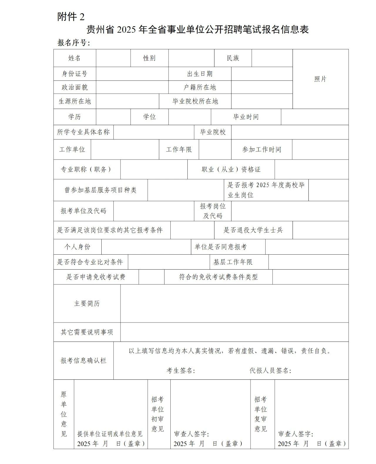 附件2:贵州省2025年全省事业单位公开招聘笔试报名信息表.docx