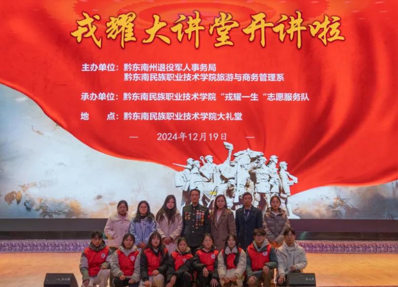 12月19日,黔东南州退役军人事务局联合黔东南民族职业技术学院举办“戎耀大讲堂”,邀请老兵宣讲团成员潘秀松以“青年强,则国防强,强国有我勇担当”为主题开展宣讲,现场900余名师生参加。