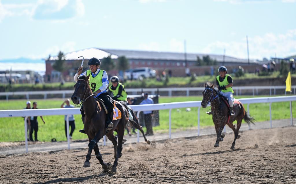 7月20日,通辽市代表队骑师宝海和赛马“追风”(左)在走马2600米比赛中。最终,他们获得一等奖。新华社记者 贝赫 摄