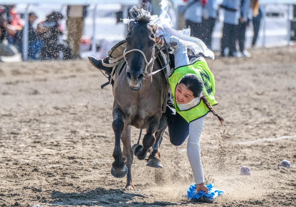 23日的跑马拾哈达比赛现场,呼和浩特市代表队的特日格勒在两轮比赛中,拾起了全部40根哈达,获得一等奖。来自锡林郭勒盟的孟根陶丽拾起38根哈达,获二等奖,她也是站上该项目领奖台的唯一一名女骑手。