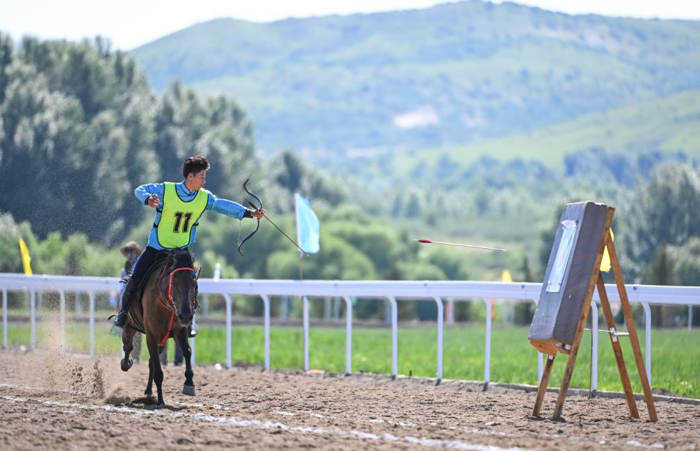 7月22日,呼和浩特市代表队骑手特日棍在比赛中射箭。最终,他获得一等奖。新华社记者 贝赫 摄