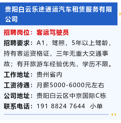 贵阳市白云区招聘客运驾驶员!月薪5000-6000元!不限学历!