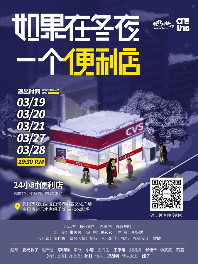 晚伶剧社旗下,有一个导演找不到角色、编剧写不出东西的剧组。他们因为执念,非要排演一出名为《如果在冬夜,一个便利店》的话剧,将于3月19日、20日、21日、27日、28日在贵阳中国贵州艺术家俱乐部 乌·box剧场上演。