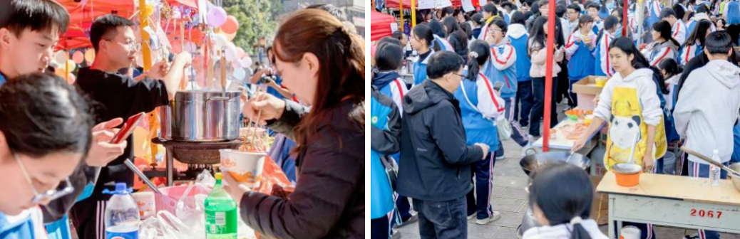 与竞技赛场的热血相伴,校园美食节同步上演“舌尖上的精彩”。各班级在指定区域精心布置摊位,饺子、烧烤、炸串、炒饭、奶茶、蛋糕等特色美食琳琅满目,创意十足的摊位海报吸引着师生驻足。从食材采购、清洗加工到现场售卖、账目核算,同学们分工协作、全程自主参与,在实践中锻炼动手能力与组织协调能力。“通过这次美食节活动,我学到了很多劳动知识,不仅增强了动手能力,还提升了团队凝聚力,真切感受到校园生活的乐趣。”高二学生向炳权的分享,道出了美食节的育人价值。烟火气十足的美食街,不仅让师生们品尝到美味佳肴,更让劳动教育落地生根,成为校园里一道温暖的风景线。