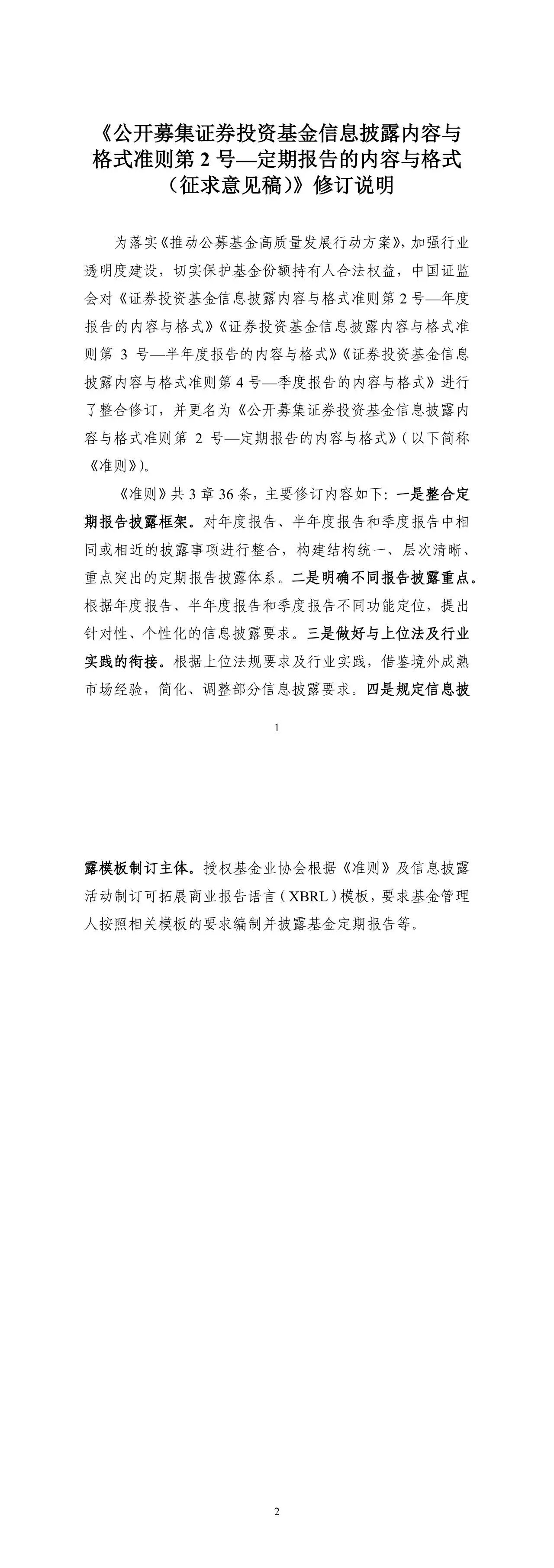 为落实《推动公募基金高质量发展行动方案》,加强行业透明度建设,切实保护基金份额持有人合法权益,中国证监会对《证券投资基金信息披露内容与格式准则第2号—年度报告的内容与格式》《证券投资基金信息披露内容与格式准则第3号—半年度报告的内容与格式》《证券投资基金信息披露内容与格式准则第4号—季度报告的内容与格式》进行了整合修订,并更名为《公开募集证券投资基金信息披露内容与格式准则第2号—定期报告的内容与格式》(以下简称《准则》),现向社会公开征求意见。