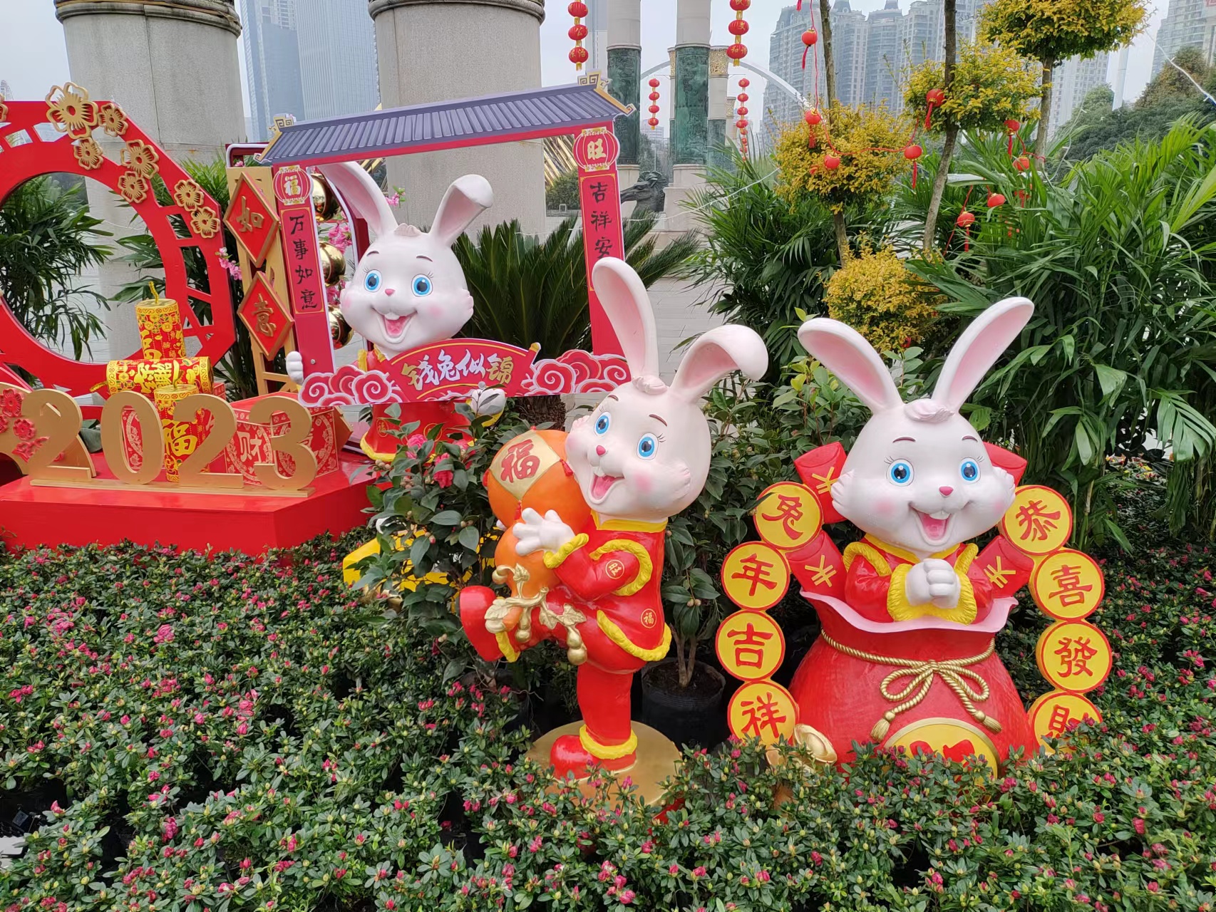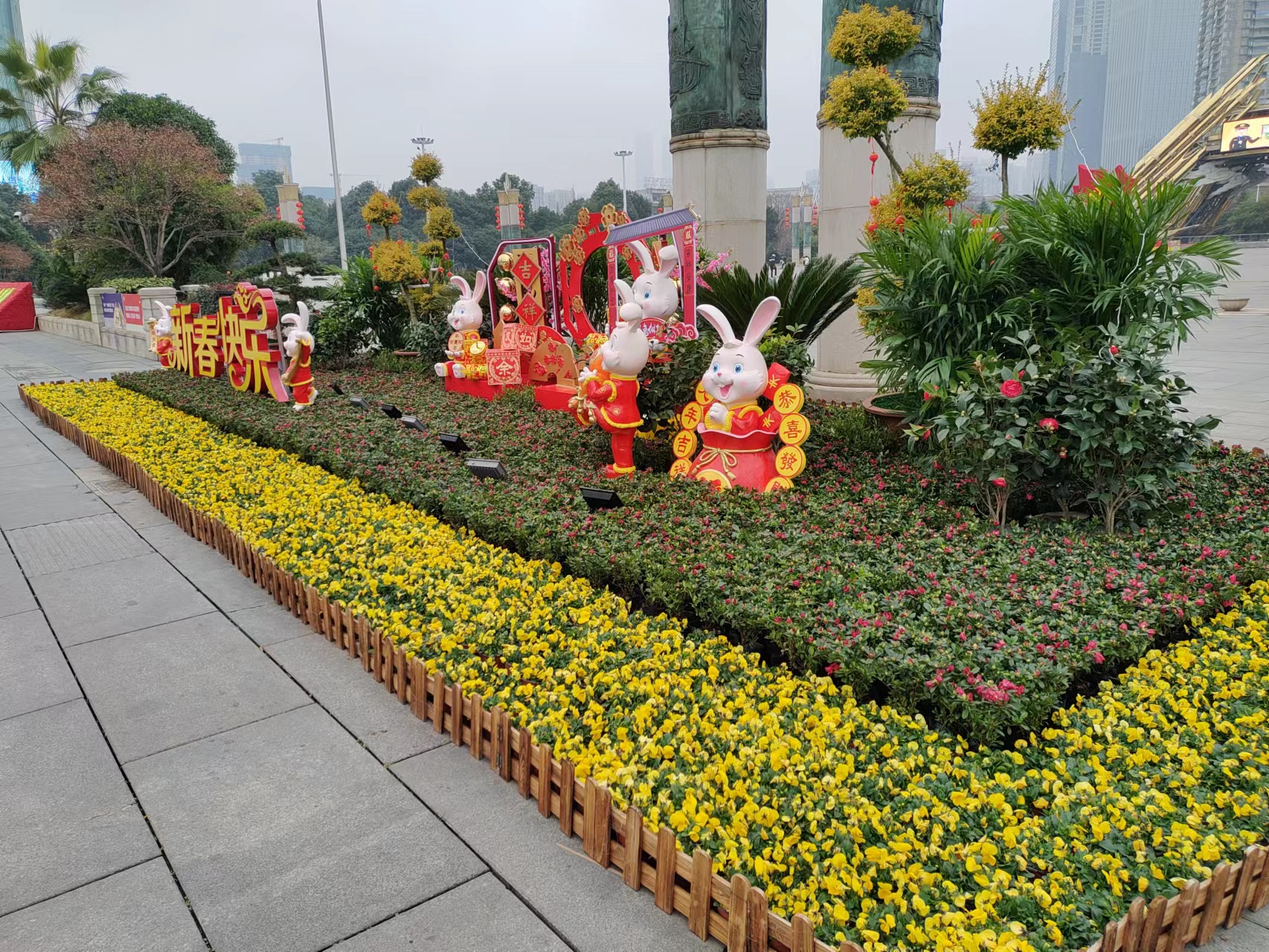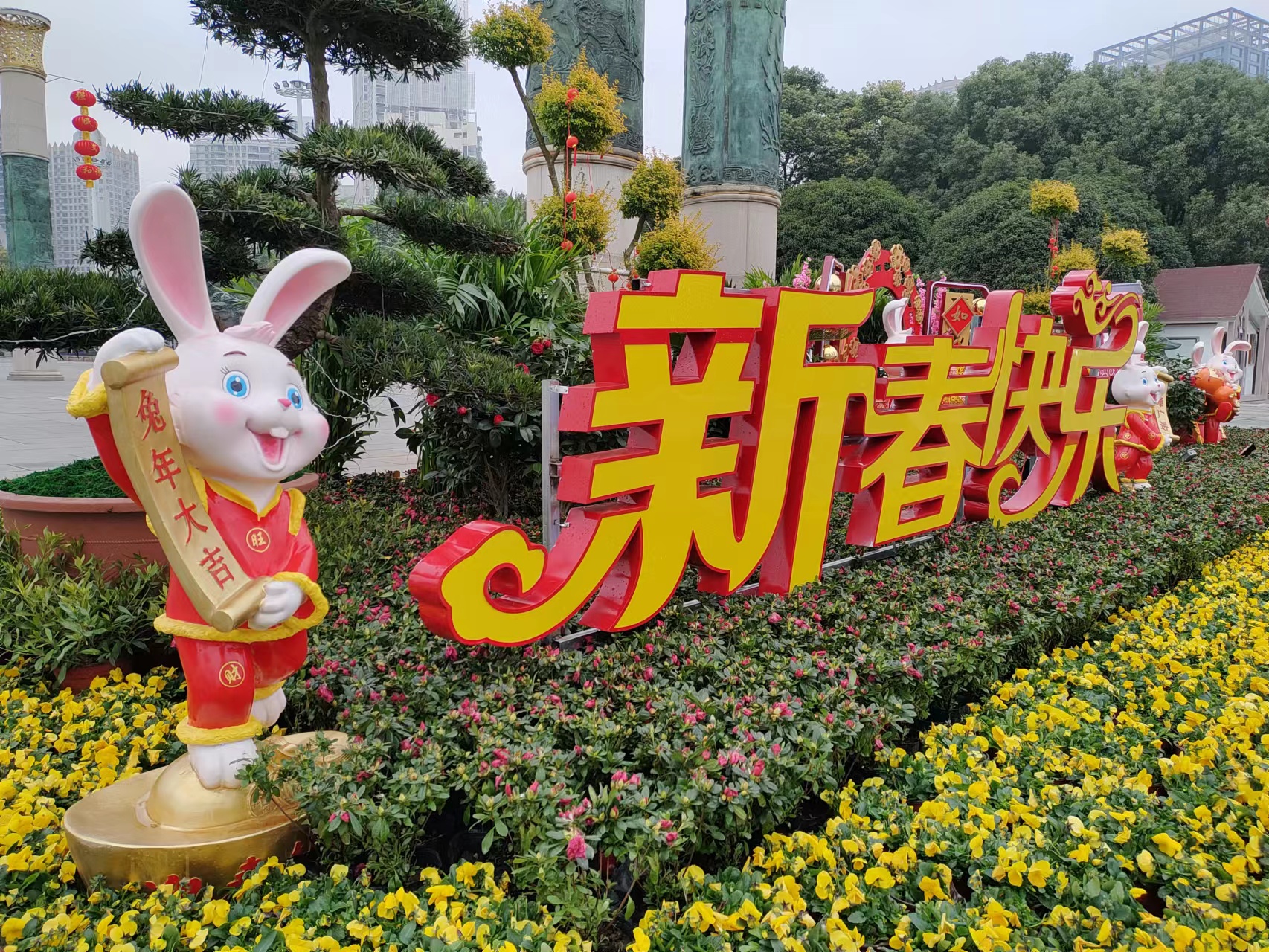 兔年新春佳节临近,贵阳市筑城广场已经装扮一新,火红的灯笼、艳丽的鲜花,还有可爱的兔宝宝,都在向人们传递着新春的问候。