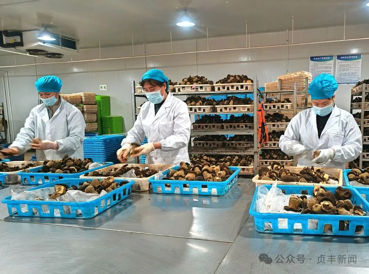 在贞丰县的一家农业企业打包车间内,同样是一派火热的生产场面。工人们熟练地将分拣好的黑牛肝菌套袋、称重、装盒,经过密封贴单后,迅速通过航空物流发往北京、上海、广州等城市。