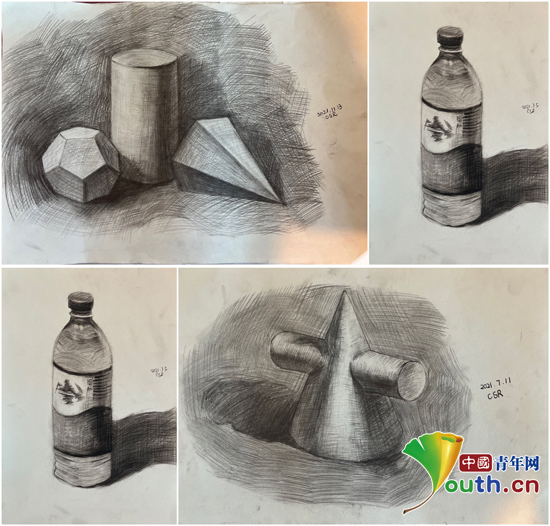 接着,志愿者们兵分两路,一组来到小睿(化名)家。小睿今年刚升入高中,聪明的他对学校课程学得得心应手,并且还参加了数学、物理竞赛。小睿还是个多才多艺的男孩子,屋内的吉他和陈列的画作无不说明了这一点,尤其是他的素描作品让人看了眼前一亮。