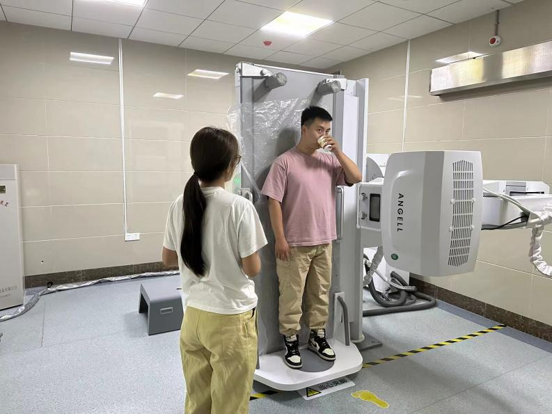 参赛队员们轮流作为sp病人配合训练上消化道造影检查的操作实践