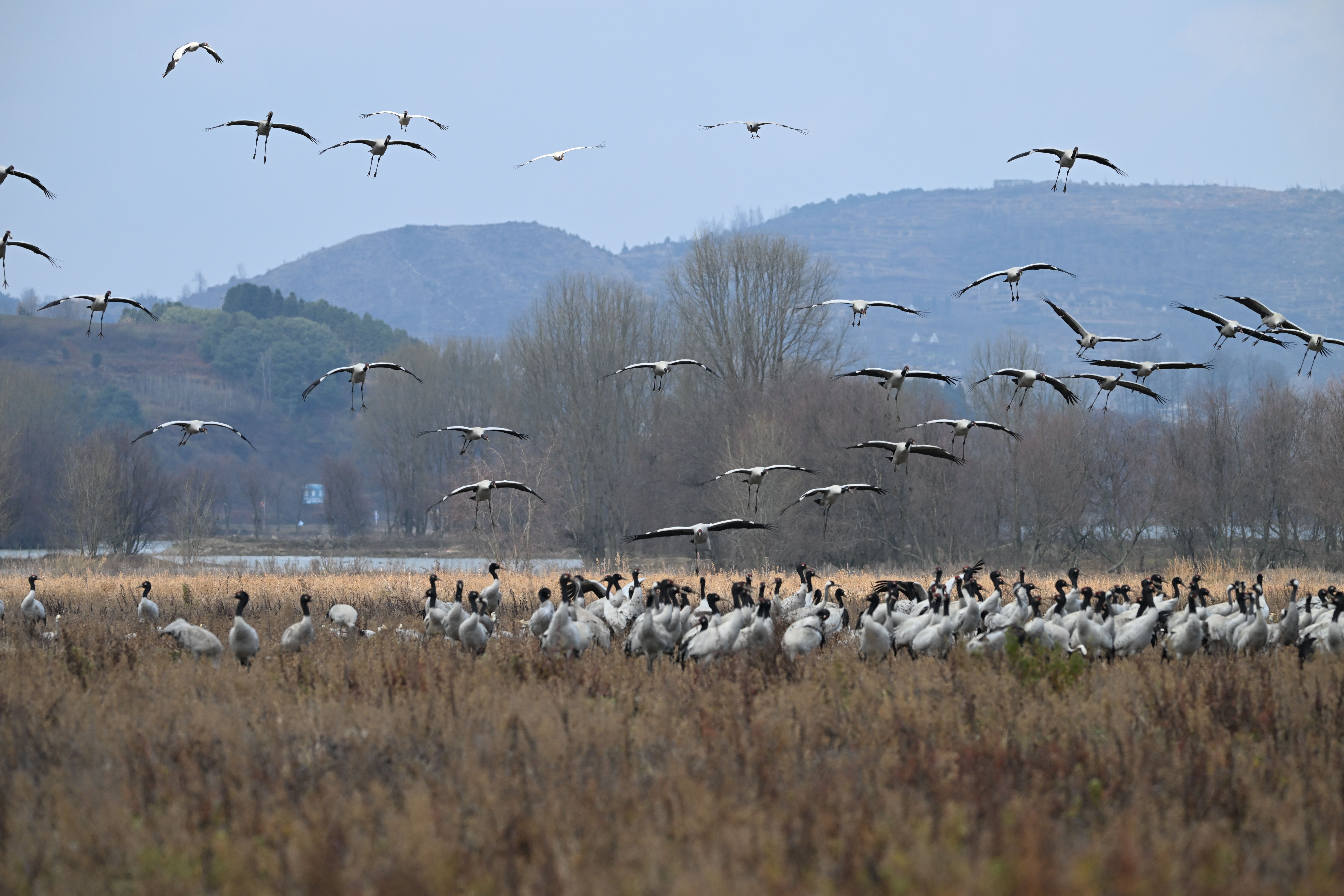 随着草海及湿地周边生态的变好,来到这里越冬的黑颈鹤数量一年比一年多,黑颈鹤头朝一边,动作整齐划一。