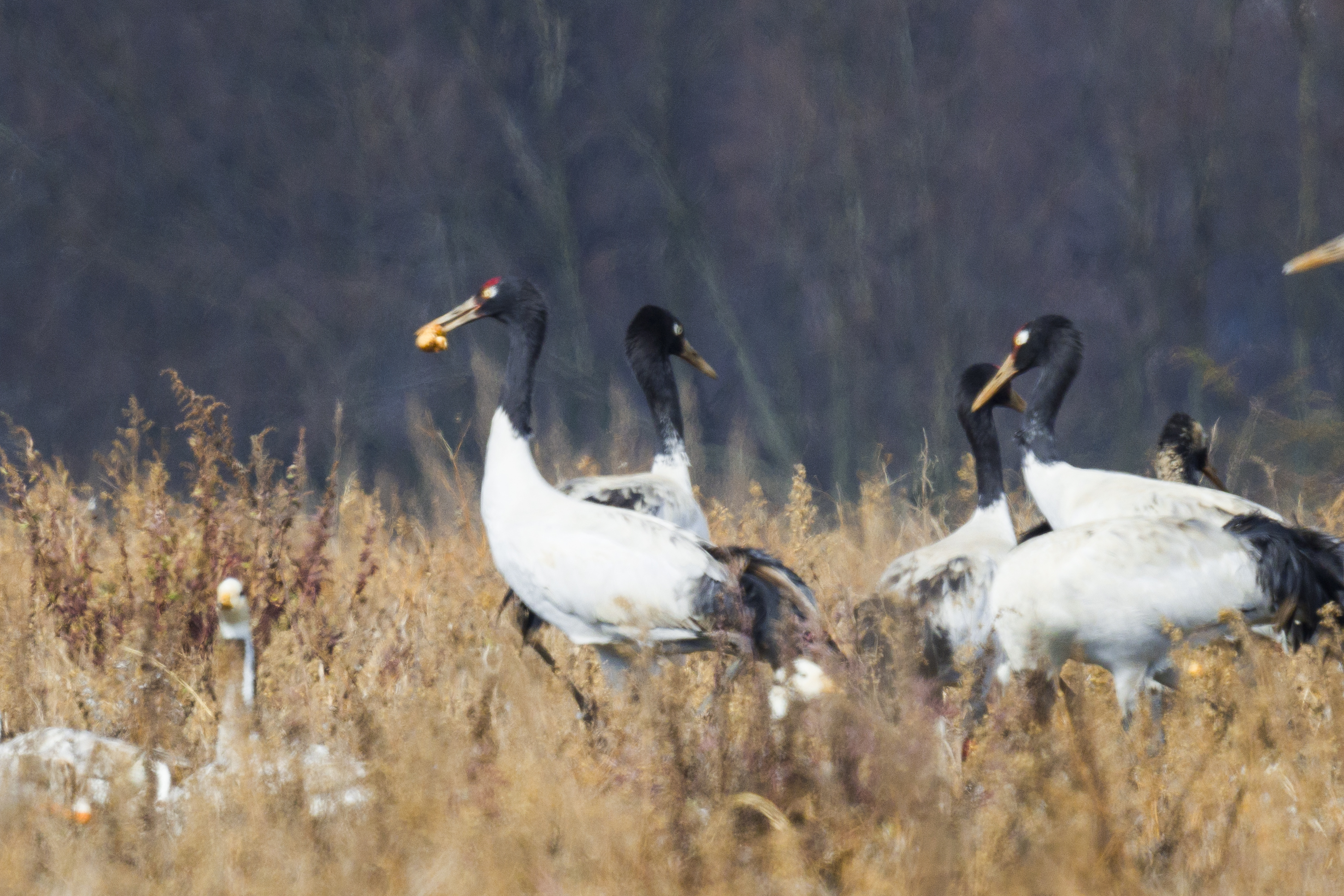 在湿地内,有的黑颈鹤从荒地里刨出来的洋芋,在鹤群中游走炫耀它的战利品。