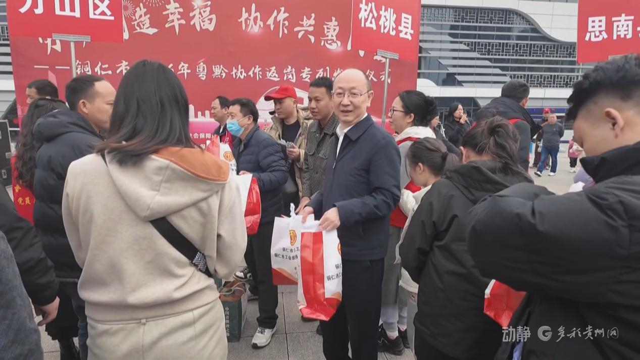 2月24号下午,铜仁市2026年粤黔协作免费返岗专列在铜仁站顺利启程,1000多名务工人员搭乘免费高铁直达广东返岗复工,志愿者为务工人员发放装有方便面、面包、牛奶等食物的“爱心礼包”。