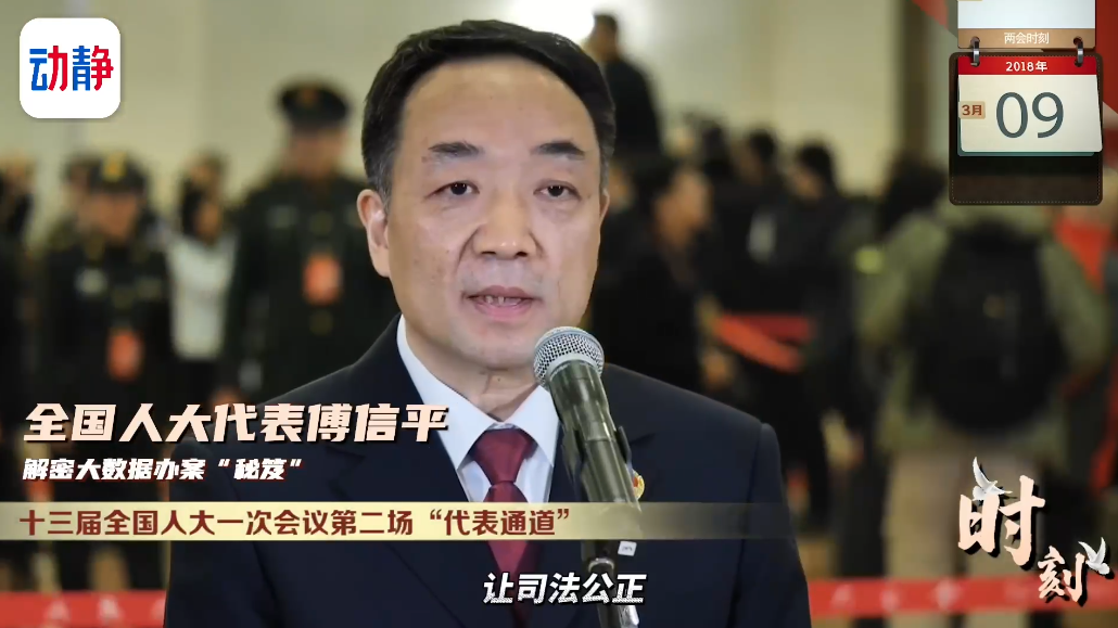 十三届全国人大一次会议第二场“代表通道”,全国人大代表傅信平解密大数据办案“秘笈”。他向记者介绍,通过大数据和信息化手段,让司法公正,看得见,摸得着。