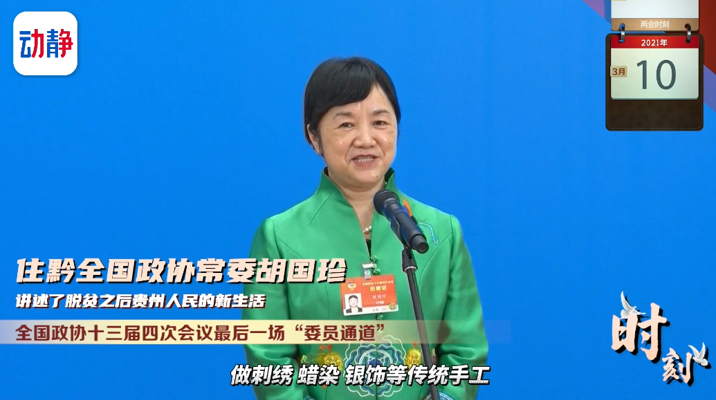 全国政协十三届四次会议最后一场“委员通道”,住黔全国政协常委胡国珍讲述了脱贫之后贵州人民的新生活。胡国珍说,现在他们在家门口做刺绣、蜡染、银饰等传统手工,每个月的收入有两三千元,既照顾了家里的老人孩子,又发展了富民的产业,还传承了民族手工技艺,可谓一举三得。