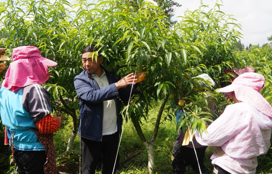 近日,记者来到该镇“桃梨欢喜”农业示范园的桃树种植基地,该镇经济发展办负责人文仕举正在指导工人们对黄桃进行疏果、套袋等作业,有的工人在摘下弱果、病果,有的在仔细地给果子套袋,大家忙得热火朝天。