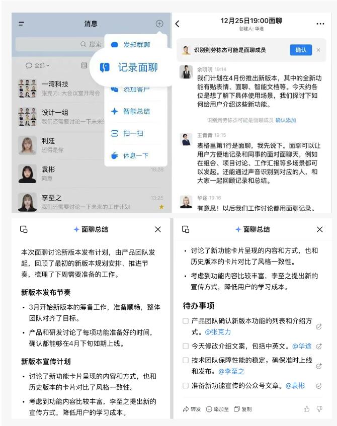 线下头脑风暴/会议时,在企业微信点击手机右上角「+」-「记录面聊」,就能借助声纹识别技术分辨发言人并快速记录。讨论后 AI 自动总结要点,还能列出待办并@对应负责人。面聊记录公开共享,参与讨论的同事都能看到。
