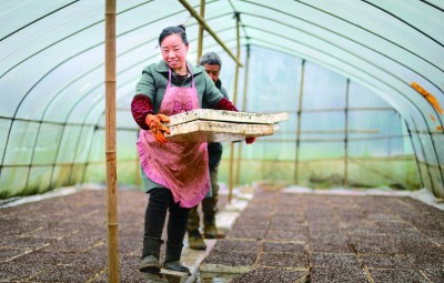 贵州黔西市雨朵镇小水井村村民正在进行大棚辣椒育苗管理。周训超摄/光明图片