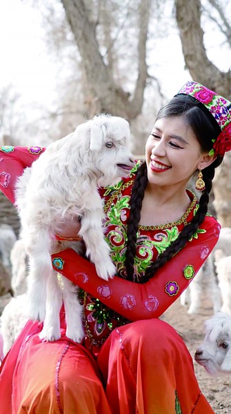 新疆库车市塔里木镇牧场内,牧民抱着刚出生不久的小羊羔。胡仁杰摄/光明图片