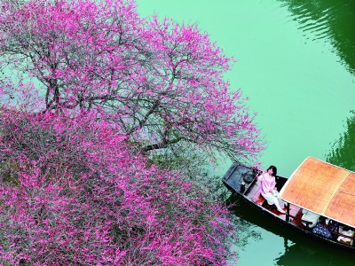 浙江杭州西溪国家湿地公园,游客荡舟溪上,赏梅游玩。周方玲摄/光明图片