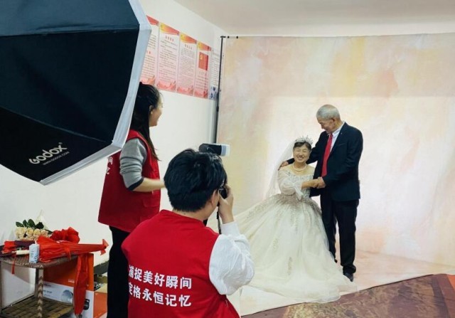 活动中,社区工作人员、志愿者提前来到现场,将活动现场精心布置得既温馨又浪漫。摄影团队携带全套摄影器材,准备好婚纱、头纱、手捧花等道具,满怀热情地迎接前来参加活动的老人。现场共计20对社区老人参加了此次拍摄活动。