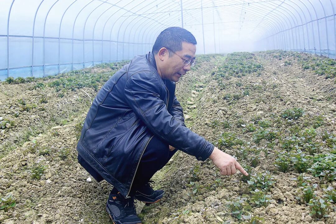 张诚在大棚里细心查看薯苗生长情况