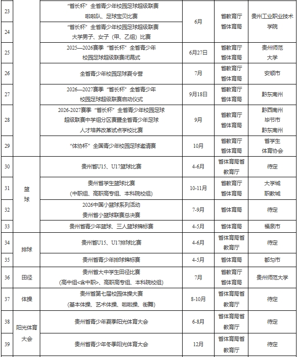 “奔跑吧·少年”2026年贵州省体教融合赛事计划: