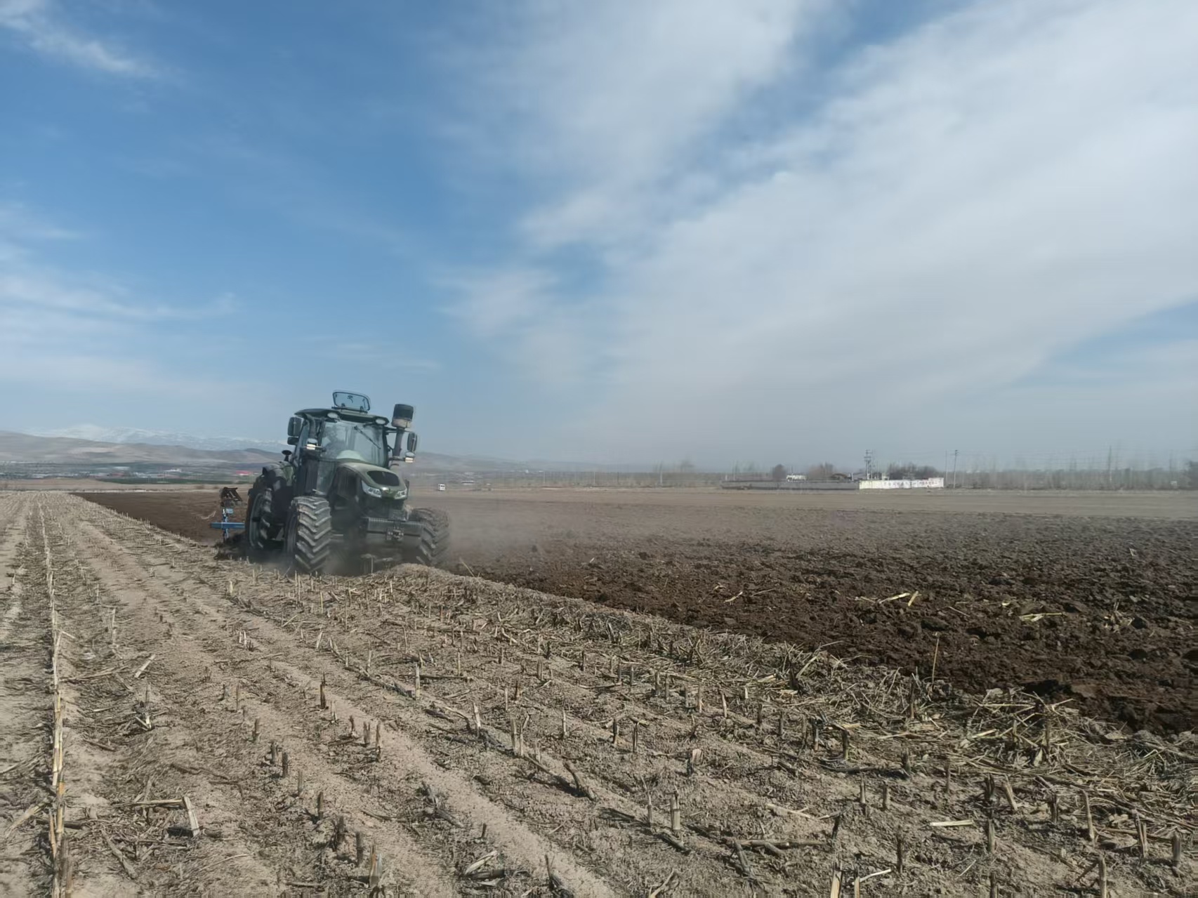 3月28日,新疆伊宁市克伯克于孜乡园艺村,拖拉机正在春翻准备种植土豆。