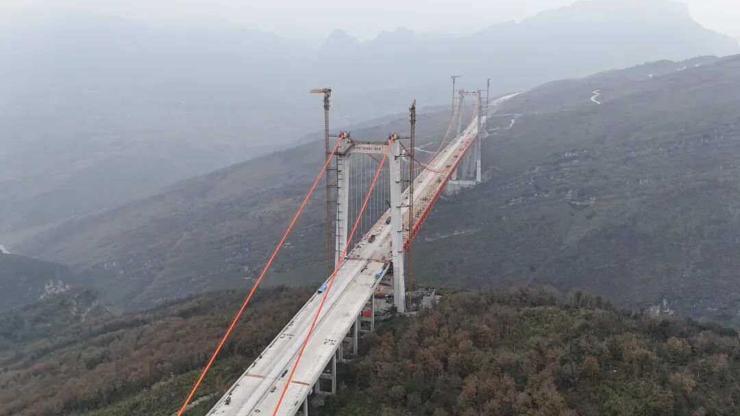 天门特大桥横跨北盘江峡谷,桥面距江面560米,是目前世界最高的双向六车道钢桁梁悬索桥。该桥主跨820米,已于去年9月23日完成合龙,当前正进行桥面系收尾施工,整体形象进度已达96.4%。