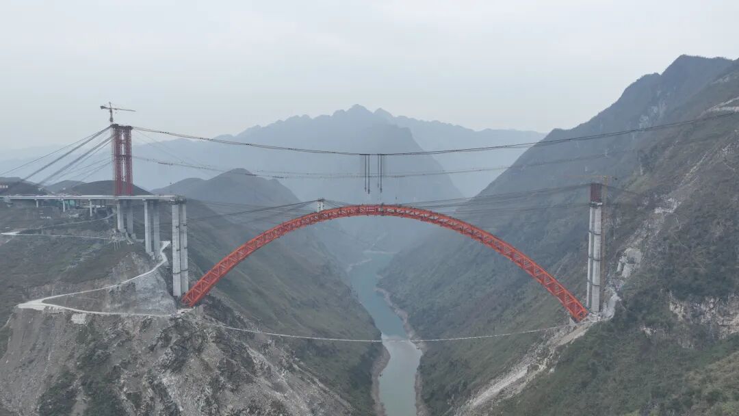 古牛河特大桥主跨520米的上承式变截面钢桁架拱桥在同类型桥梁中位居世界第二。目前主拱圈已于2025年1月5日成功合龙,全面转入扣背索拆除及拱上立柱复拼阶段,整体进度达81%。
