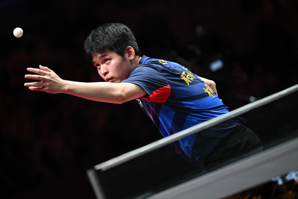 9月1日,黄石华新队选手林诗栋在比赛中发球。新华社记者 丁磊 摄