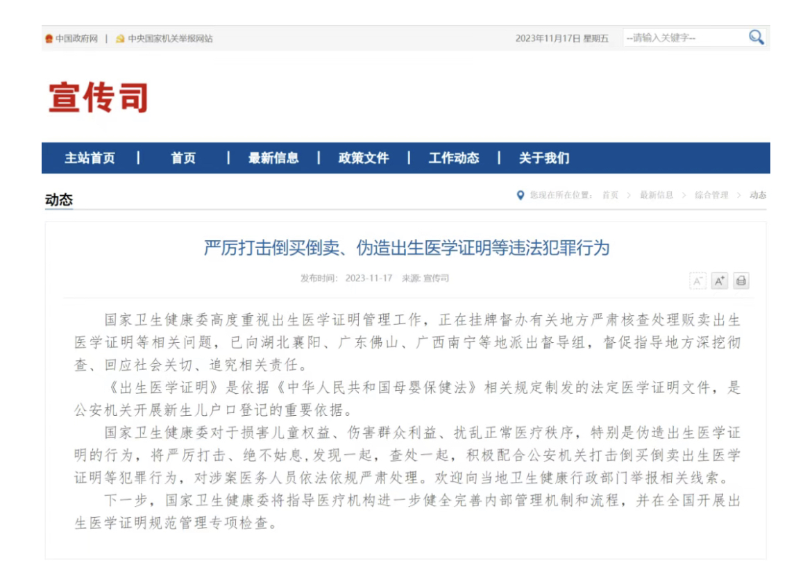 国家卫生健康委高度重视出生医学证明管理工作,正在挂牌督办有关地方严肃核查处理贩卖出生医学证明等相关问题,已向湖北襄阳、广东佛山、广西南宁等地派出督导组,督促指导地方深挖彻查、回应社会关切、追究相关责任。
