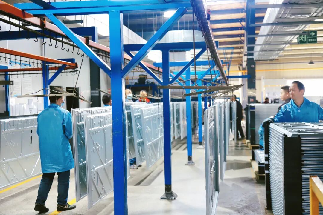 跟随自动化设备的运转流程可以看到,冲压成型的电视机背板通过自动传送带,经“空中连廊”无缝输送至喷涂车间,工人只需将背板挂上自动吊轨,后续的清洗、喷涂、烘干、固化等工序,全部由设备完成。