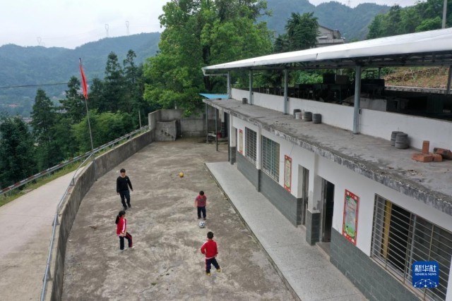 在广西壮族自治区灵川县海洋乡中心岐教学点,蔡教宏和学生在课间做游戏(无人机照片)。