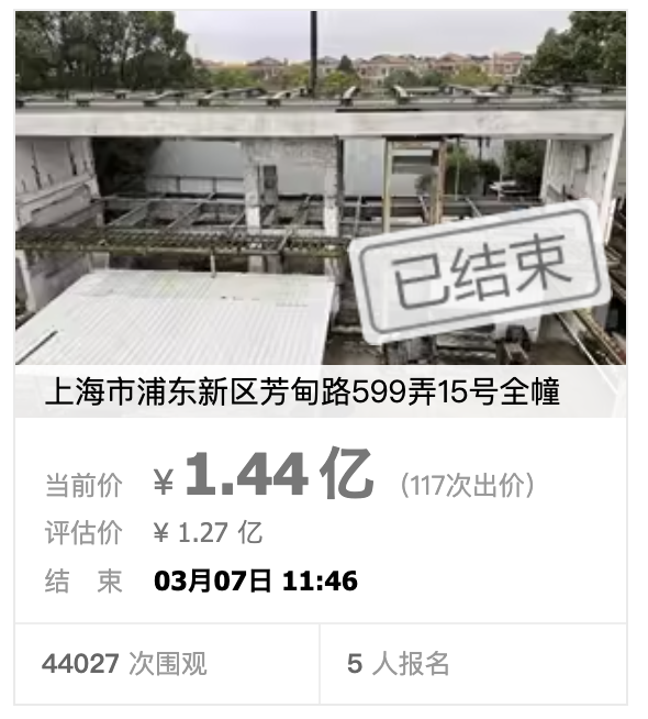 阿里拍卖平台显示,位于上海市浦东新区芳甸路599弄15号的全幢别墅在经过117轮竞价后已被成功拍出。