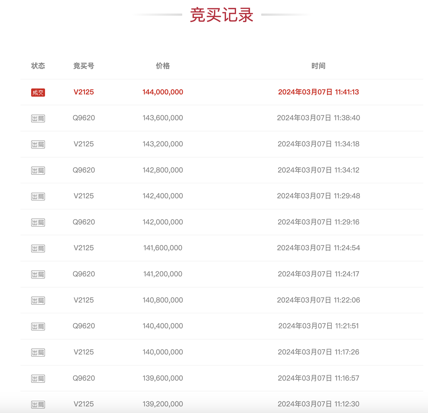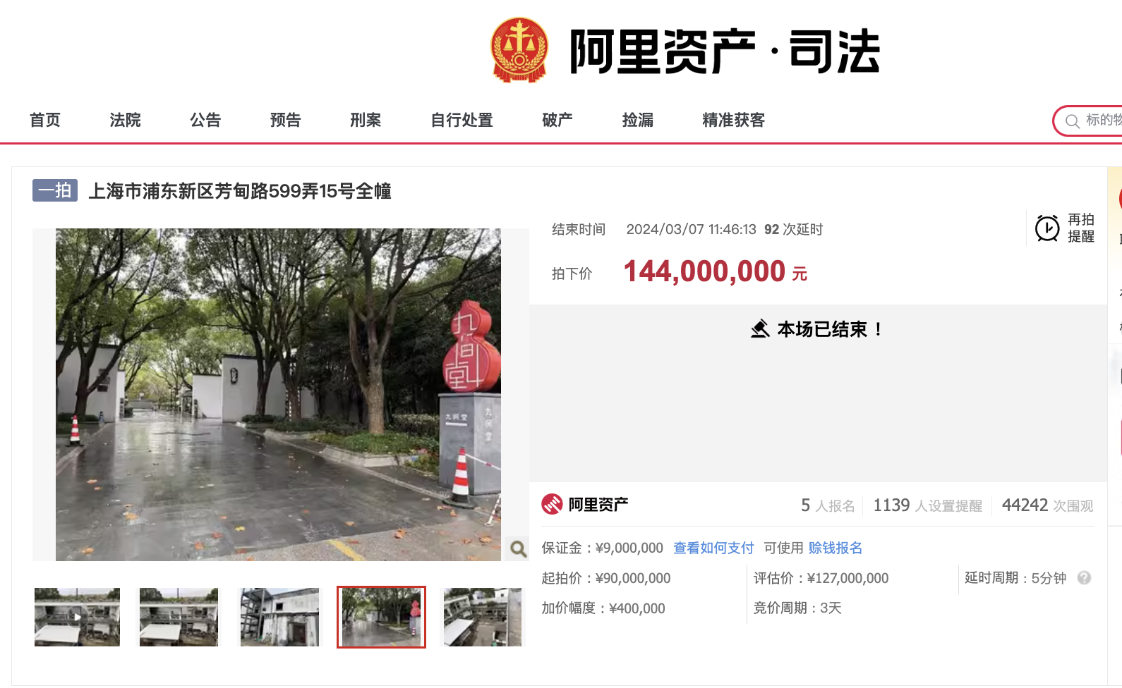 根据阿里拍卖平台,该标的共吸引超4万次围观,且有5人报名,在经过117轮竞价后,该标的于3月7日11时41分由竞买号V2125以1.44亿元的价格成功竞得。