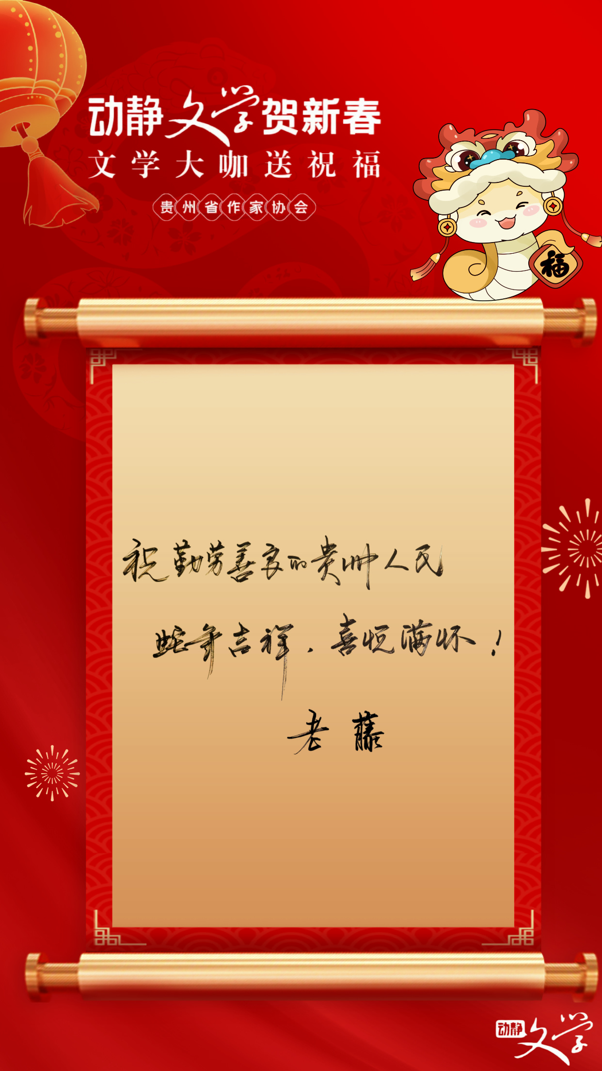 字间饱含千般意,动静文学贺新春!贵州广播电视台携手贵州省作家协会,诚邀文学名家共襄“动静文学·文墨迎春”盛宴。作家朋友们以笔为舟,以墨为桨,满载着对文学的热爱与对贵州的深情,亲手撰写下一张张新春贺卡。新春佳节,我们特将这些饱含深情与诗意的祝福,献给每一位钟情于文学的读者朋友。蛇年大吉,巳巳如意!
