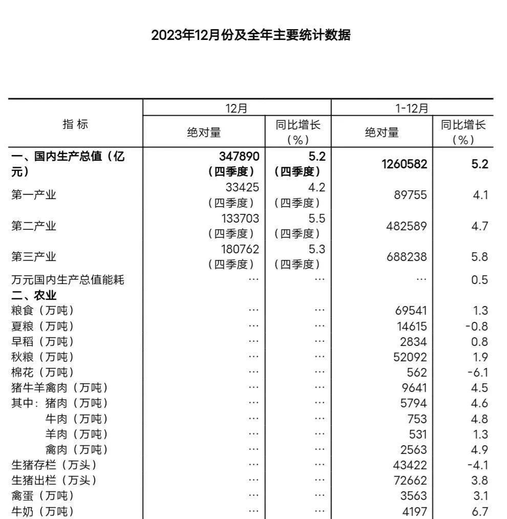 1月17日,国家统计局发布了2023年数据。其中,在农业领域,粮食产量再创新高,畜牧业生产稳定增长,一产增加值4.1%。