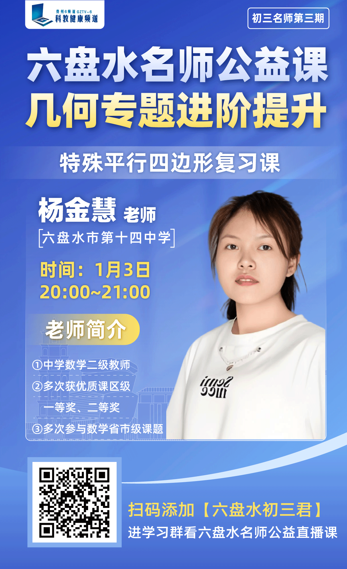 第三期直播定于1月3日(周六)20:00-21:00,六盘水第十四中学优秀教师杨金慧老师将作为嘉宾亮相直播间!杨老师深耕初中教学多年,对中考命题规律、学生易错点及提分策略有着深刻研究,此次她将以“特殊平行四边形复习”为主题,结合历年真题案例,拆解高频考点、梳理答题逻辑,帮孩子把“模糊努力”转化为“精准得分”。