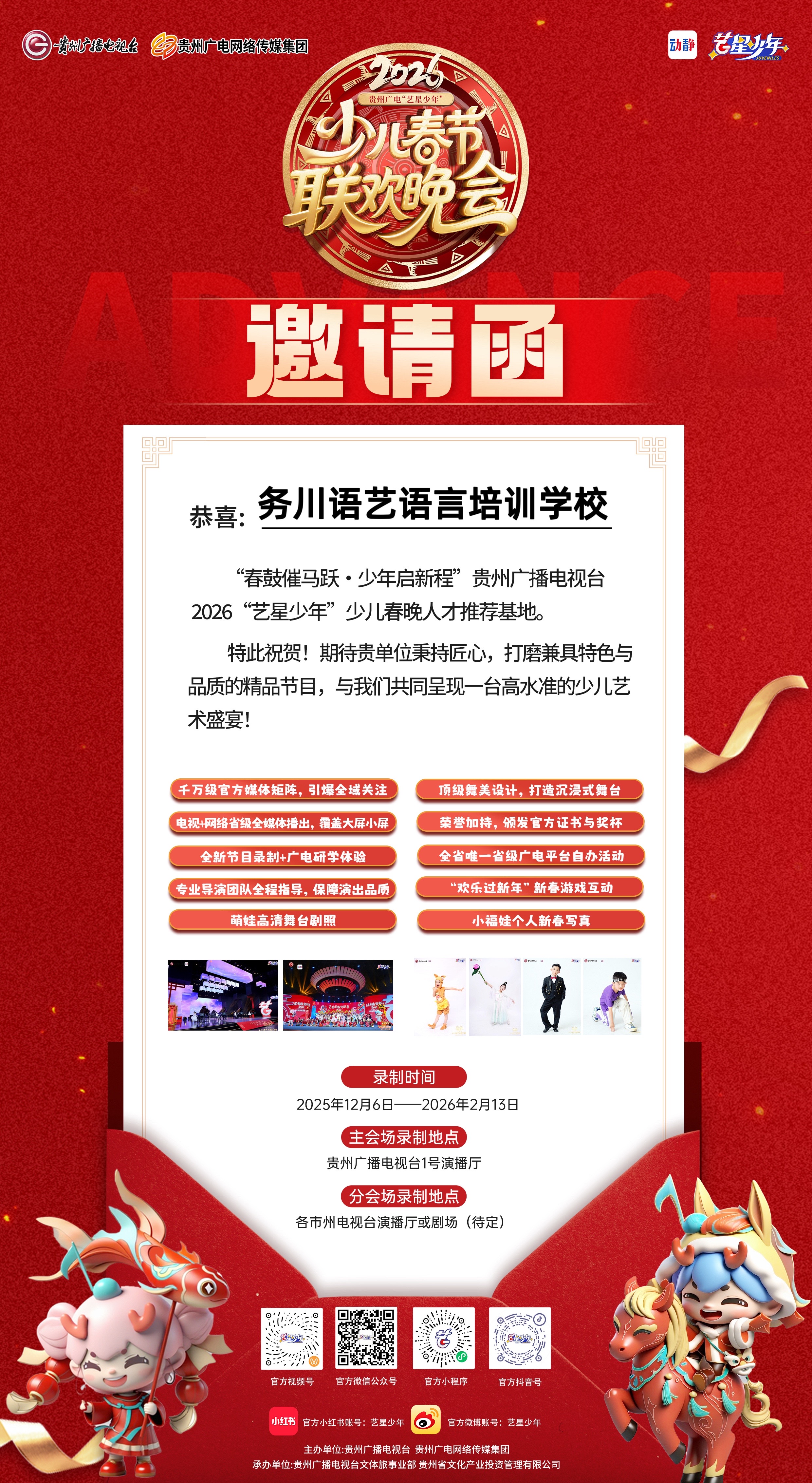 此次,务川语艺小主持的导师们将携手小朋友们参与2026贵州广电“艺星少年”少儿春节大联欢活动的现场录制。