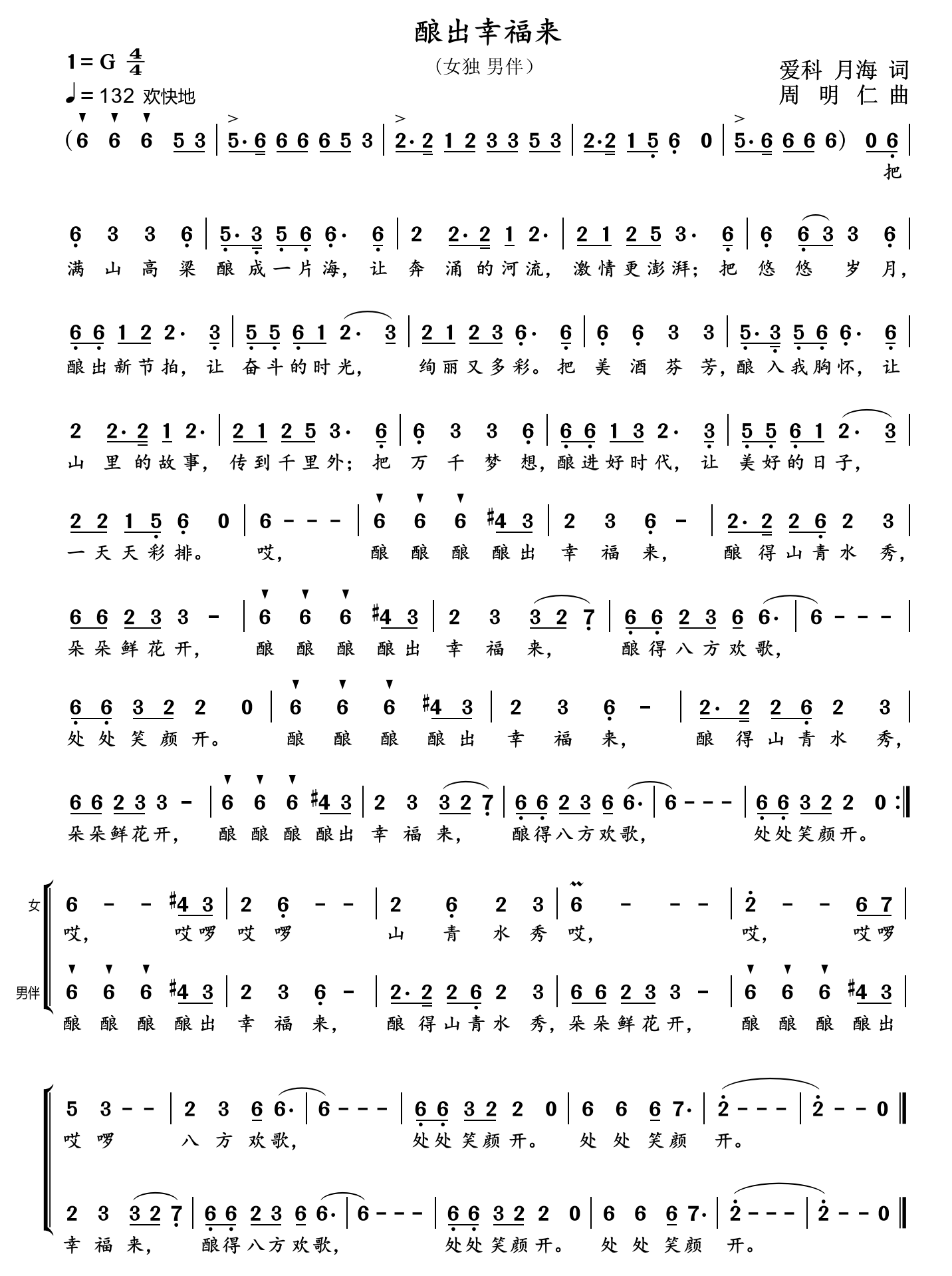 歌曲《酿出幸福来》为仁怀市音乐家协会采风创作作品。歌曲以酿酒文化为创作背景,并将“酿”的内涵进行了深度拓展和提升,全词以“酿”为词眼,艺术地呈现了“酿”的过程及目的,表现了“酿”的时代性和美好愿景,塑造了作为“酿造者”的“我”的幸福、阳光形象。传递了积极向上的生活态度。其艺术表现手法既具有传统韵味,又融入了现代元素,使得歌曲既能够深入人心,又能够与时俱进。