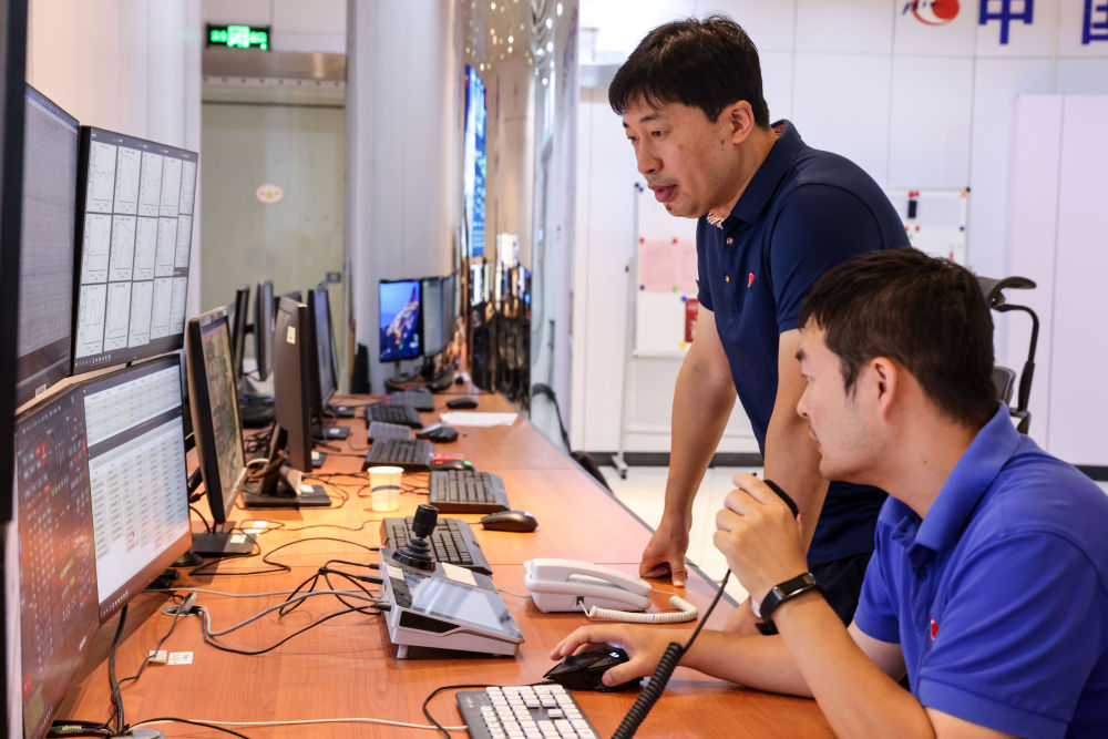 2022年8月25日,FAST运行和发展中心常务副主任、总工程师姜鹏(后)在“中国天眼”的总控室内与工作人员交谈(维护保养期间拍摄)。新华社记者 欧东衢 摄