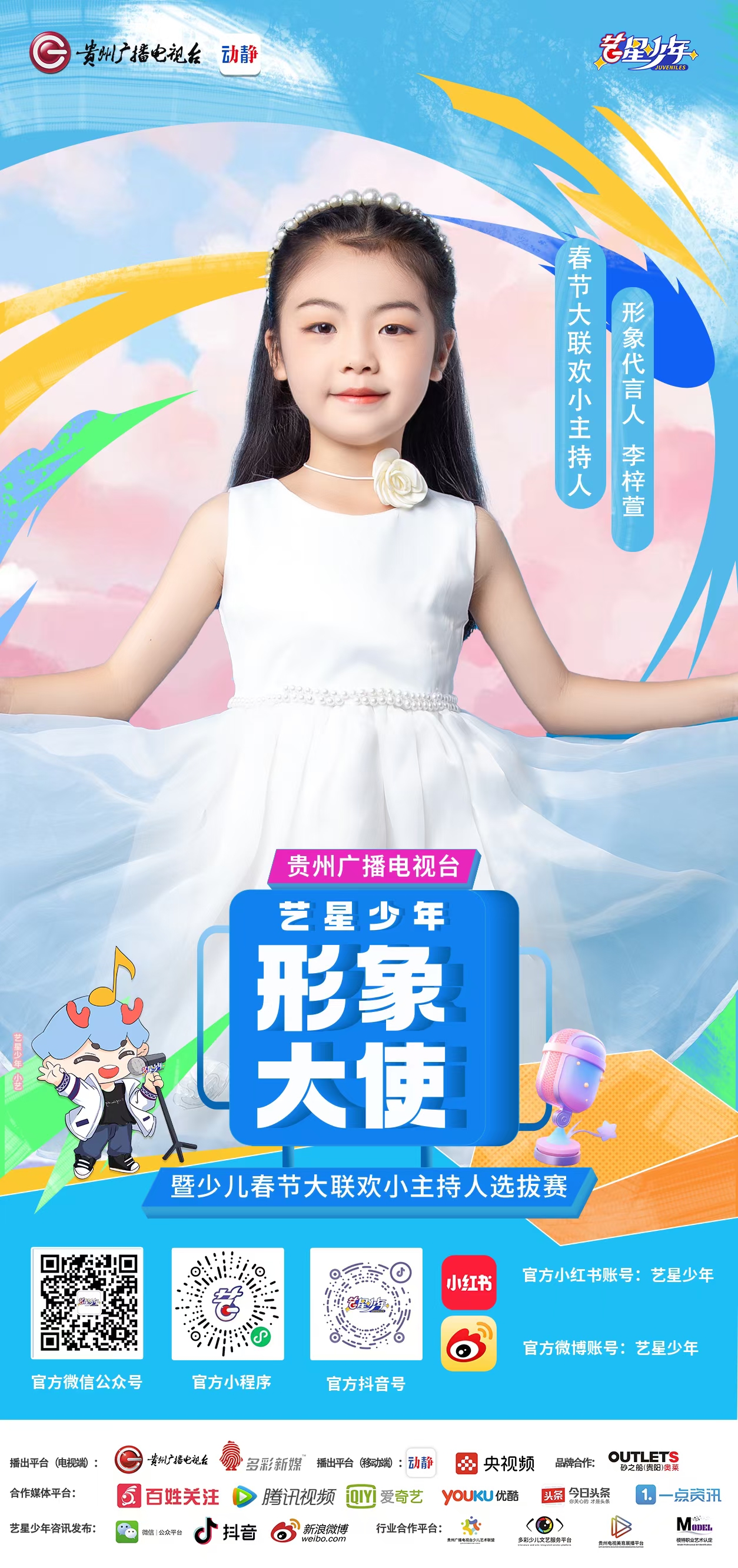 大家好!我叫李梓萱,今年8岁啦,是一名二年级的小学生,来自松桃小明星艺术学校。非常荣幸能成为“贵州广播电视台2025艺星少年少儿春节大联欢活动”的小主持人,我一定会珍惜这次宝贵的机会,在舞台上闪耀如一颗小星星。我会用我最甜美的笑容,迎接每一位观众的目光,为大家带来满满的快乐和温暖。