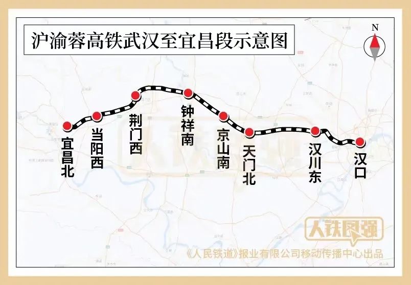 沪渝蓉高铁线路总长约2100公里,途经上海、江苏、安徽、湖北、重庆、四川等六省市。沪渝蓉高铁武汉至宜昌段位于湖北省境内,起自武汉市,经天门市、荆门市,终至宜昌市,正线全长313公里,设汉口(既有)、汉川东、天门北、京山南、钟祥南、荆门西、当阳西、宜昌北8座车站。