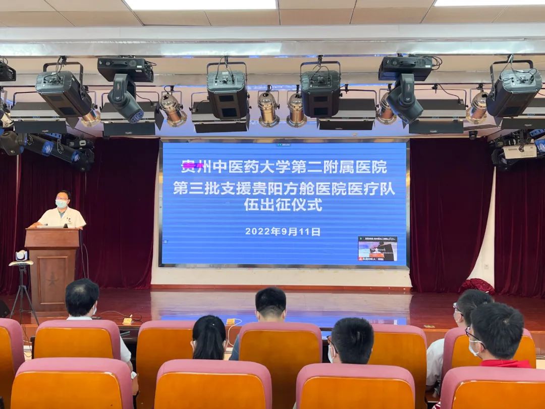9月11日,战“疫”支援集结号再次吹响!贵州中医药大学第二附属医院派出第三批5人组成的医疗队再次出征贵阳市方舱医院,驰援疫情阻击战前线。贵州中医药大学党委书记杨柱同志,贵州中医药大学党委副书记、校长刘兴德同志,贵州中医药大学第二附属医院领导、在院职能部门负责人参加出征仪式。